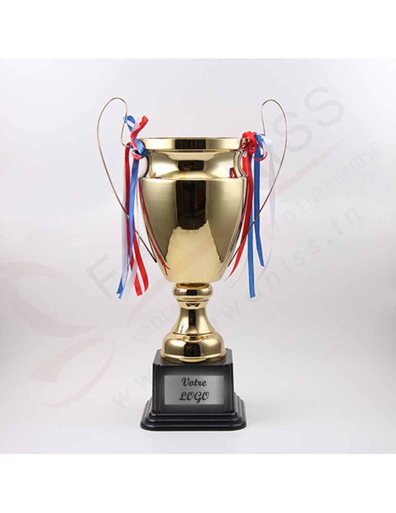 Cette coupe est disponible en stock chez fawaniss.tn, en 3 tailles différentes. La coupe est dorée ou argentée. Sur le pied vous pouvez ajouter une plaque gravée avec votre propre texte.