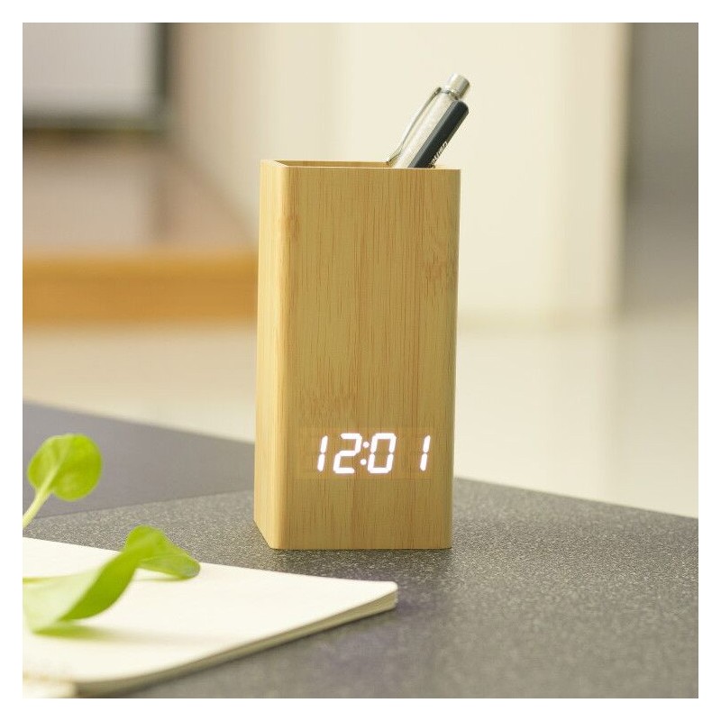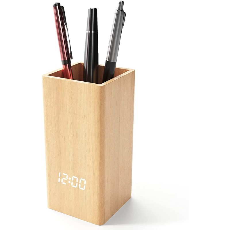 Faites le choix de ce porte stylo / pot à crayons personnalisé en bois avec réveil numérique ! Ce pot vous permettra L'affichage de l'heure, la date, 2 alarmes, compte à rebours, et thermomètre. Fonctionne avec piles, ranger l'ensemble des fournitures qu'il vous faut pour travailler, que ce soit chez vous en télétravail ou au bureau.