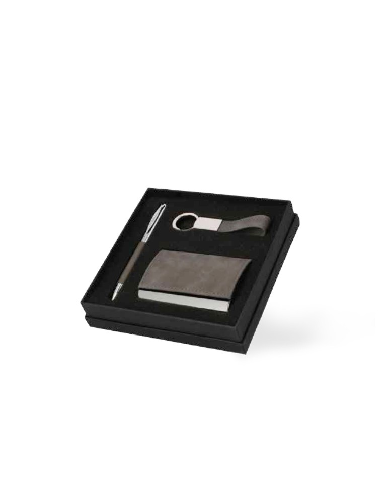 Coffret Set 3 pièces qui se compose d’un Stylo, Porte Carte Visite et d’un Porte-clés le tout revêtu de similicuir Gris Idéal pour une personnalisation au Laser – Gravure de votre Logo.
