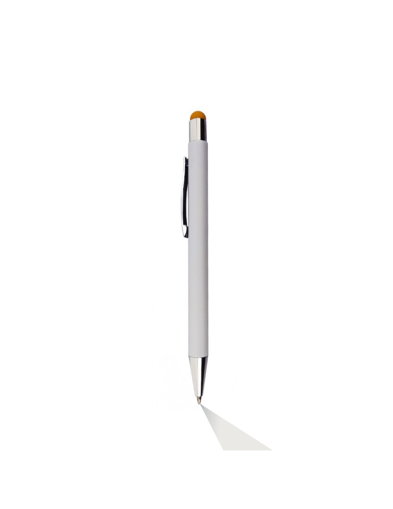 Stylo/stylet à bille promotionnel en aluminium. Avec son corps blanc, son bouton poussoir doté d'un embout tactile coloré pour votre smartphone ou votre tablette et ses attributs métalliques, ce stylo est très élégant.