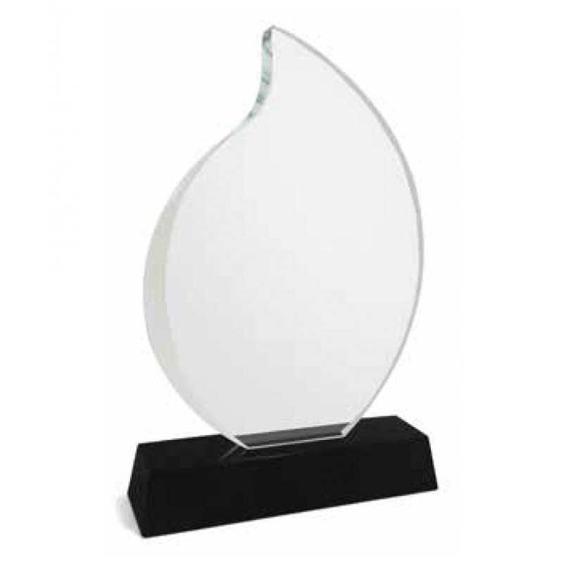 Sobriété et élégance caractérisent ce trophée en verre qui reprend la forme d’une goutte d’eau et d’une flamme.